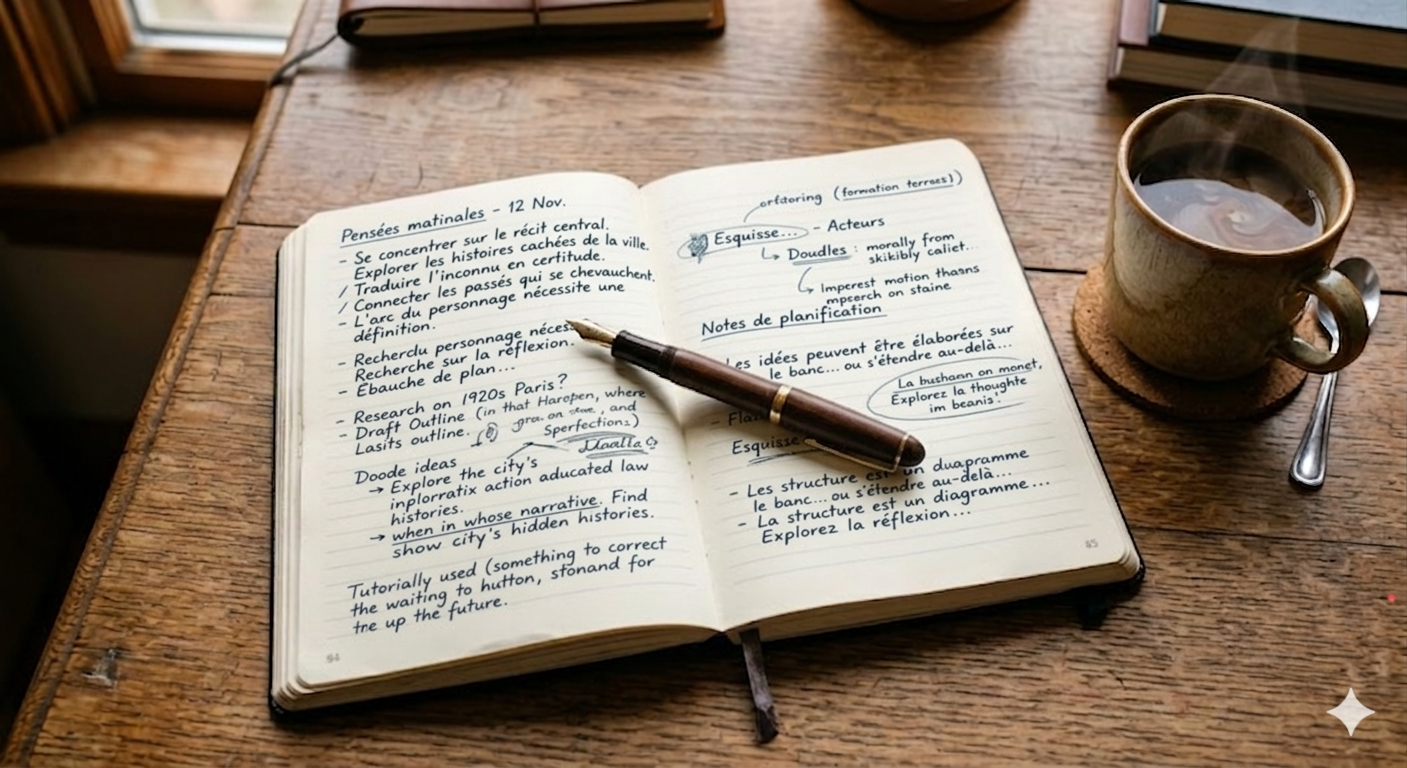 J'écris mon premier roman à 45 ans. Un personnage de 44 ans, employé dans un magasin de chaussures, qui découvre un carnet magique. Je connais la page blanche, les doutes, les renoncements. Je fais ce que je t'accompagne à faire.
